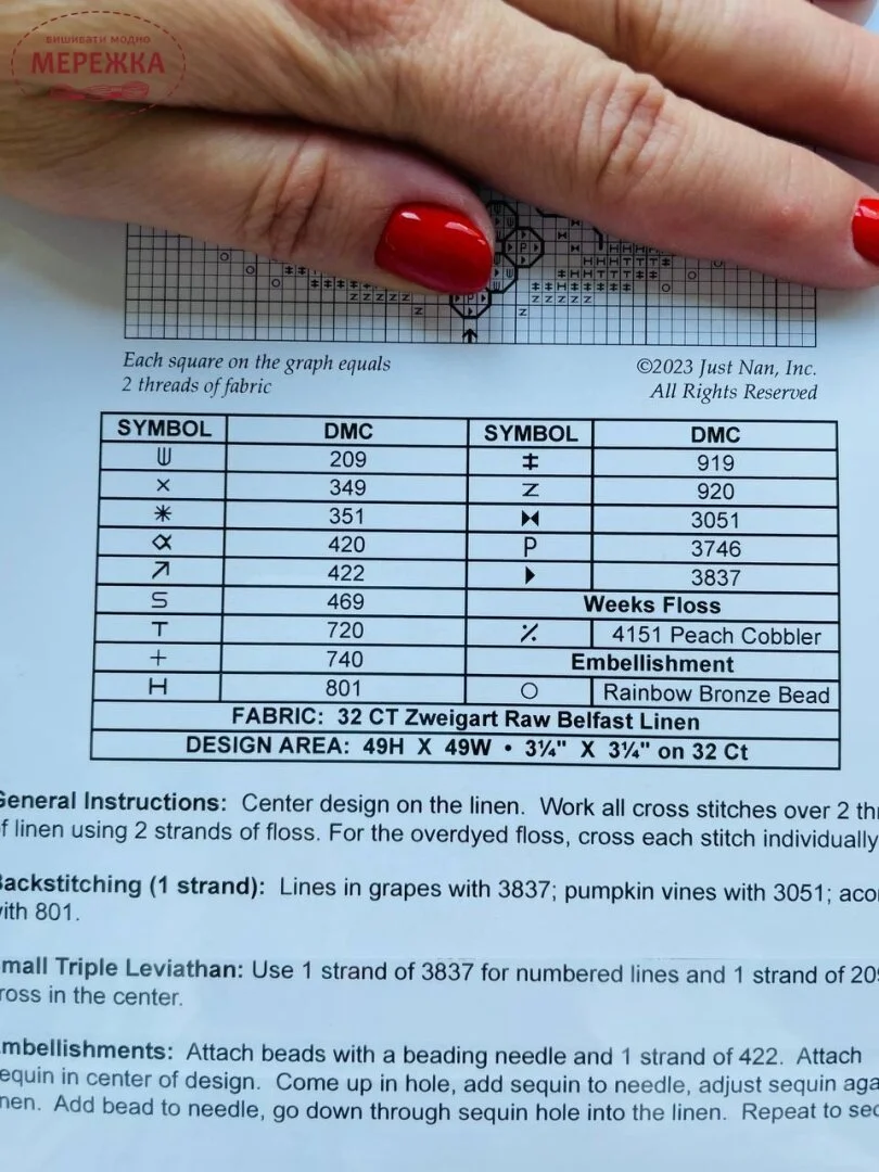 Цей американський виробник був новатором у тому, щоб прикрашати свої дизайни скарбами-шармиками, надаючи їх разом зі схемою. Також особливість Just Nan є те, що окрім хрестика в своїх схемах вони використовують спеціальні стібки. Схеми напрочуд зрозумілі та легкі, отже в вас не виникне складнощів із вишиванням за зборкою готового виробу.