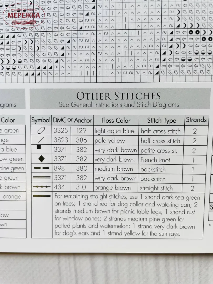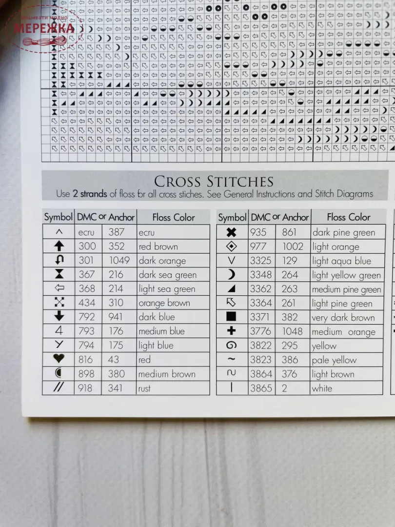 Рекомендовані нитки: DMC Ecru, 300, 301,367, 368, 434, 792, 793, 794, 816, 898, 918, 935, 977, 3325, 3348, 3362, 3364, 3371, 3776, 3822, 3823, 3864, 3865.