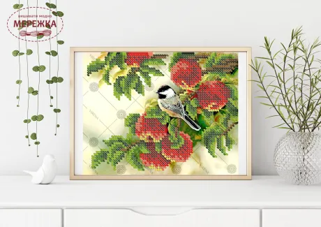 Схема із синичкою та яблуками для вишивки бісером на габардині, який проклеєний флізеліном.
