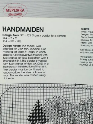 - тканина: 28 ct tan. Jobelan, 35 ct unbleached linen (можливі варіанти Zweigart Cashel 3281/322 Sand (100% льон), Permin, 35ct 066/01 Nature/undyed (100% льон))