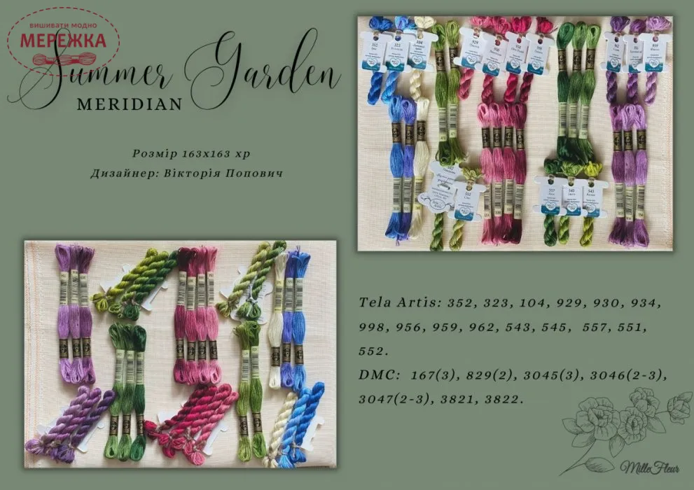 Муліне DMC: 155, 167(3), 470, 471, 554, 746, 829(2), 3045(3), 3046(2-3), 3047(2-3), 3345, 3346, 3347, 3354, 3687, 3688, 3803, 3821,