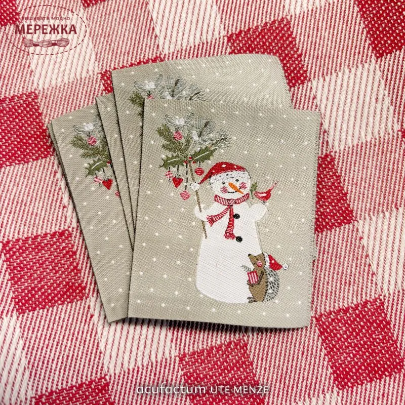 Ця чарівна плетена нашивка переносить нас у чарівну зимову країну чудес. Веселий сніговик, закутаний у смугастий шарф і різдвяну шапочку, стоїть на снігу, а його супроводжує пташечка, що несе в дзьобі гілочку падуба. У правій руці сніговик тримає святково прикрашену ялинкову палицю. Перед ним маленький їжачок у різдвяній шапочці з невеликим подарунком у лапках. Ця деталізована нашивка додасть ідеальної нотки святковості та тепла вашим різдвяним проектам.