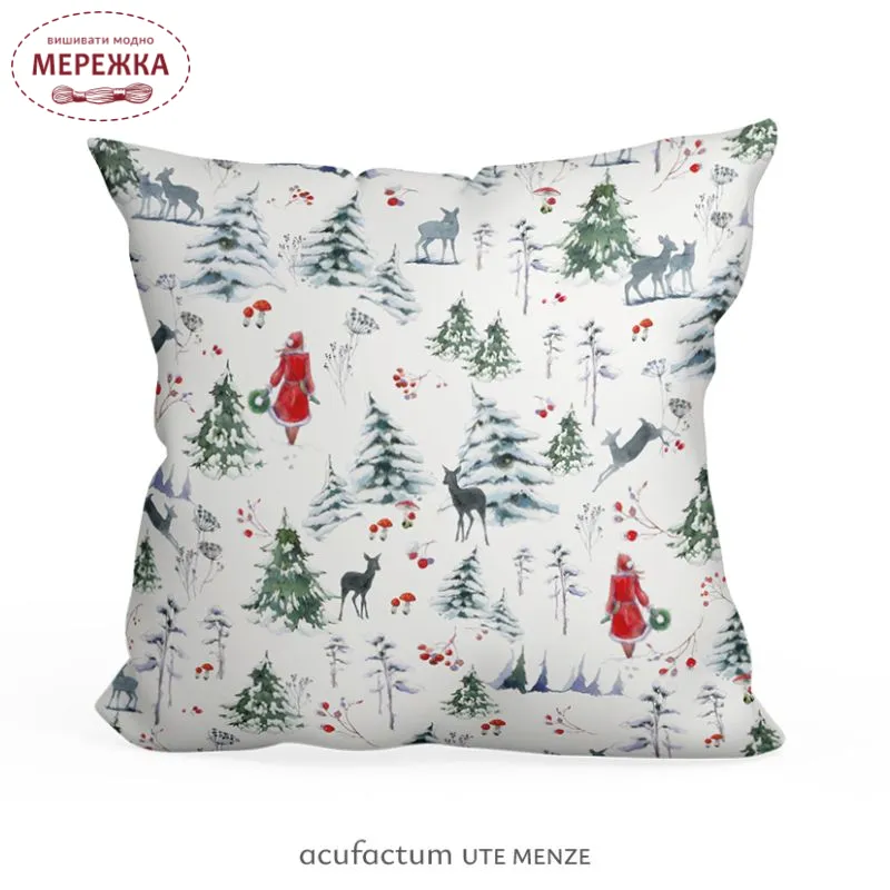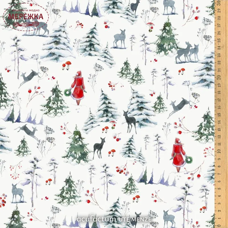 Жінка в червоному пальто йде крізь снігову тишу, тримаючи зелений вінок. Ніжні олені спостерігають з дерев, а дрібні деталі, такі як гриби, шипшина та вкриті інієм трави, додають глибини та шарму сцені.