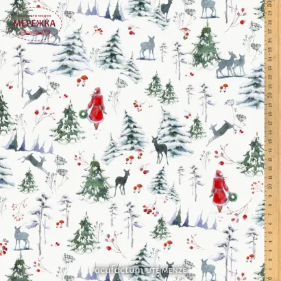 Бавовняна тканина «Зимова прогулянка» втілює тиху магію засніженого лісового пейзажу. У м’яких акварельних тонах Софія Дрешер малює мирний зимовий пейзаж, що викликає асоціації з довгими прогулянками лісом, де сніг хрумтить під ногами, а час ніби зупиняється.