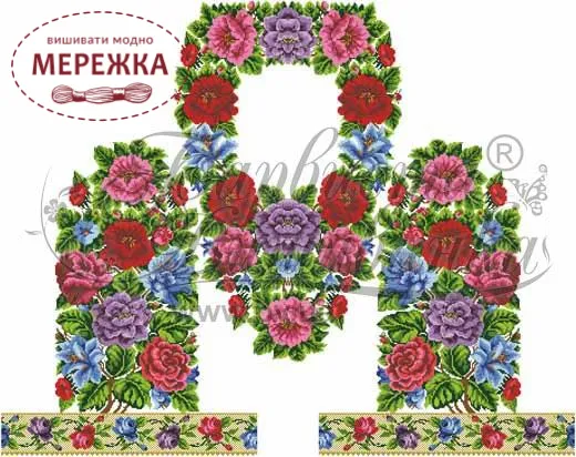 Тканина із нанесеним малюнком-схемою, на котрій дуже легко вишивати, оскільки вона має спеціальні місця для вколювання і виколювання голки, чіткий малюнок. Склад тканини: домоткане полотно (50% поліестеру, 50% котону). Тканина розкроєна на куски розмірами: 180см*70 см - 1 шт, 45см*75см - 2 шт.
